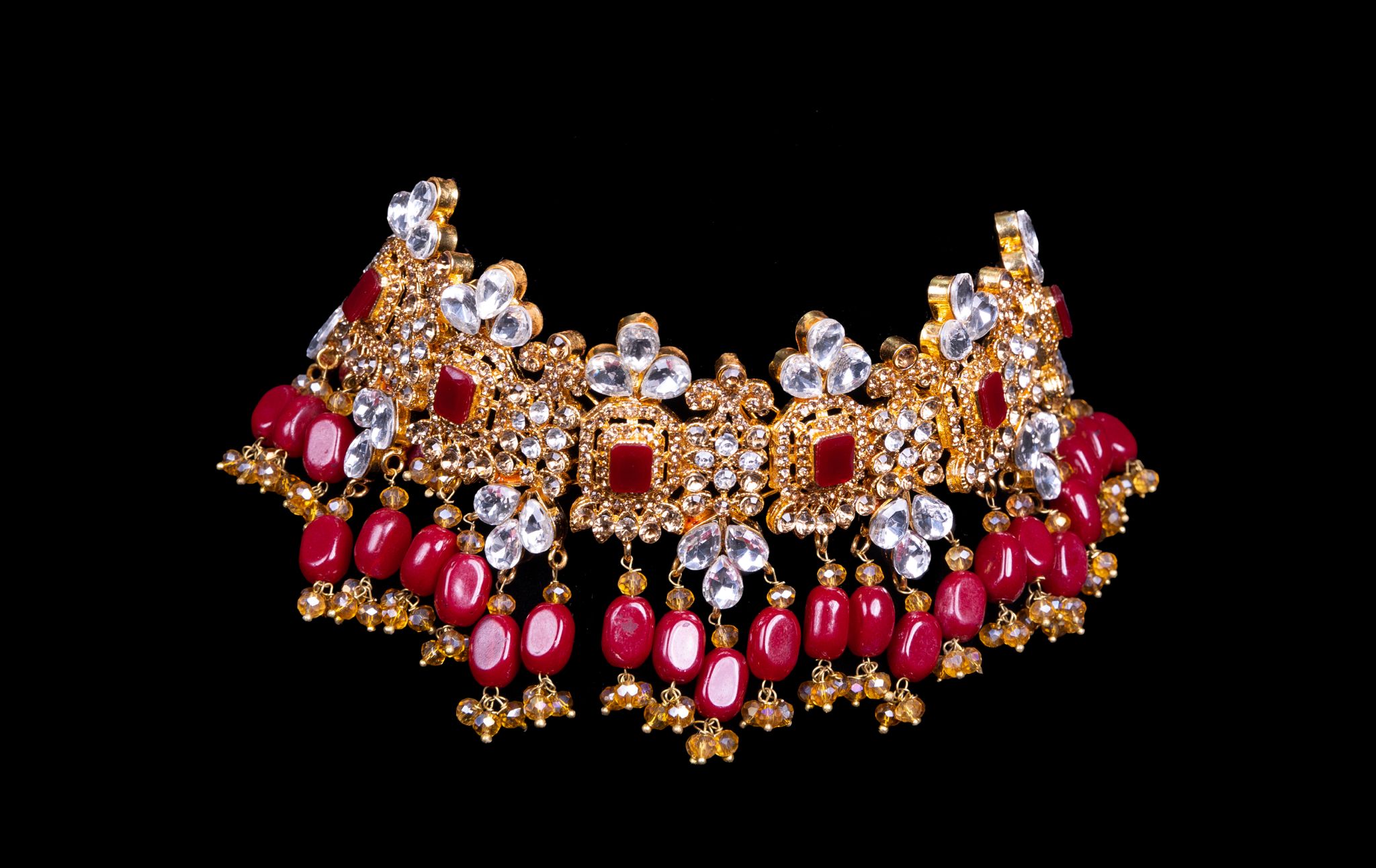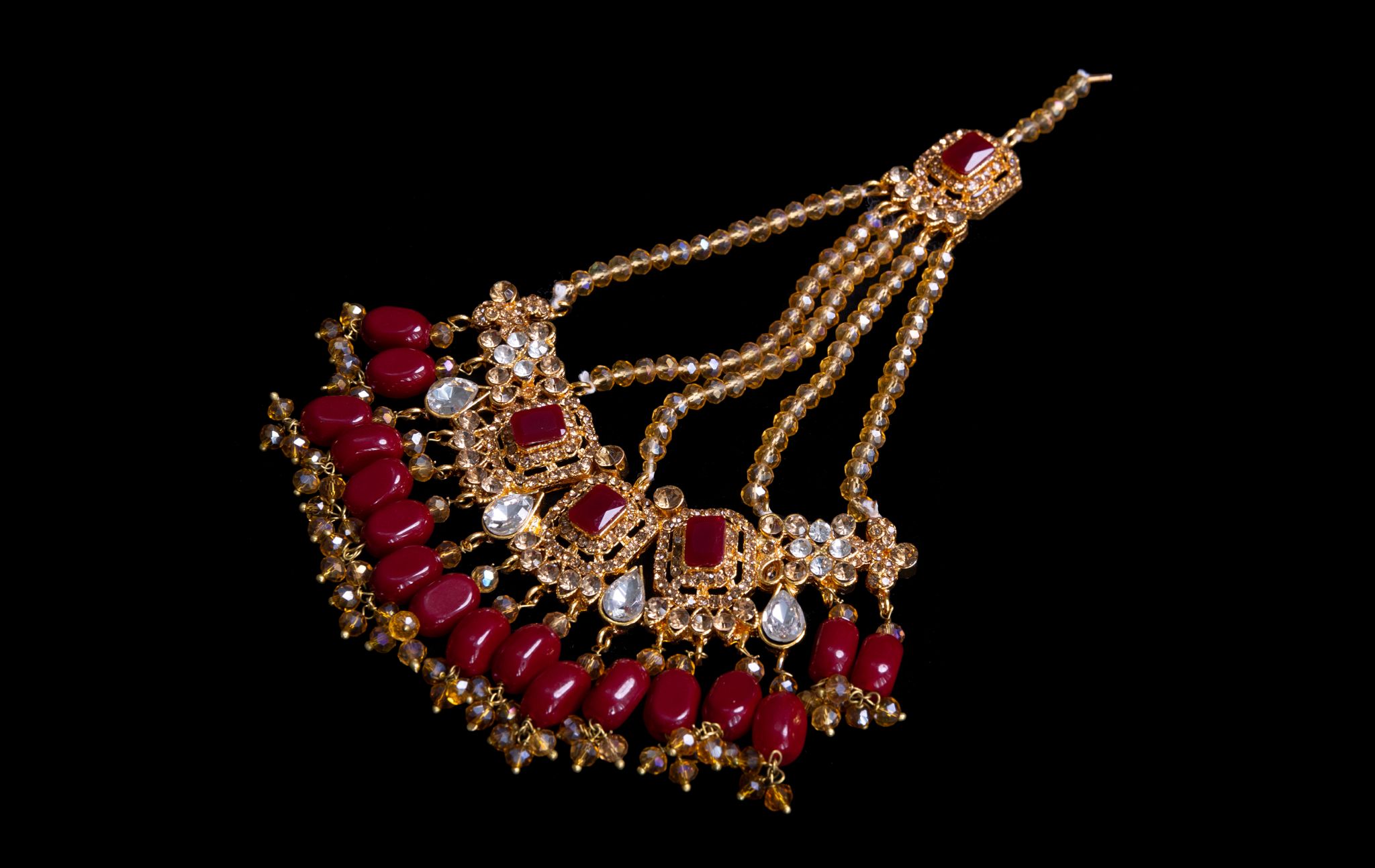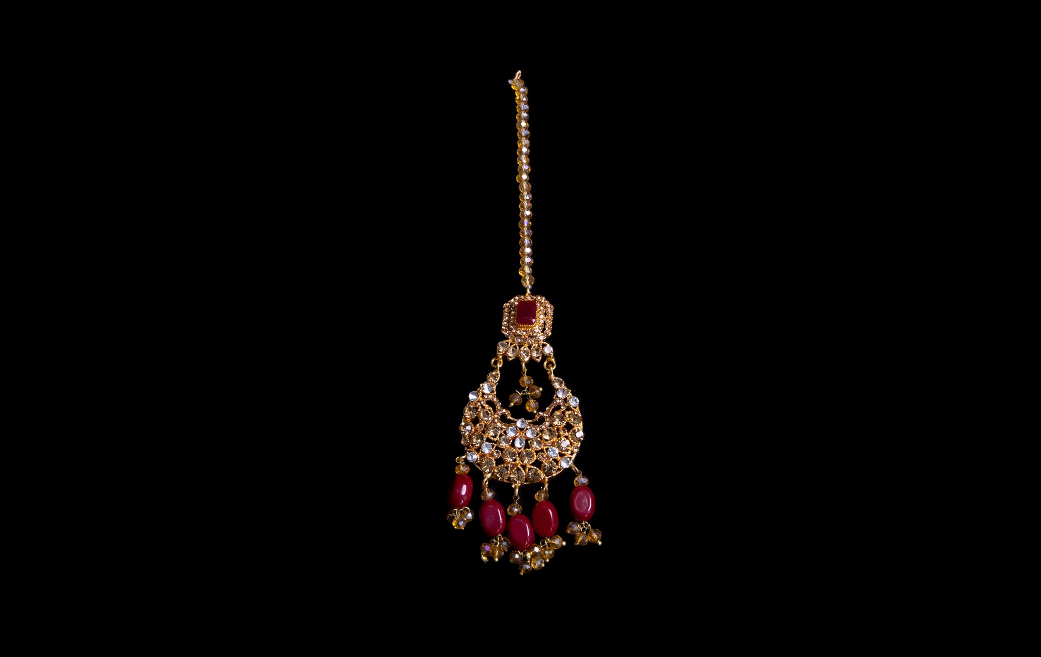 This bridal jewelry set, MB2 – Mahana Bridal, is an ornate and traditional bridal piece. The set features intricate gold detailing, encrusted with red gemstones, and adorned with pearl embellishments. Additional Accessories: The set includes smaller matching pieces, a nose ring (nath) and a matching passa & tikkahnhair accessory. The crystals add an elegant finishing touch, making it perfect for a bridal ensemble. This jewelry set works perfectly for traditional South Asian bridal wear, complementing outfits like lehengas, sarees, or heavily embroidered bridal dresses. *Special offer rate terms * All Bridal sets & ex-display sets @ £100 on offer Postage £10 per set Collection available It does not include handpieces shown in some illustrations Limited stock available *All offer sets are excluded from the returns policy *