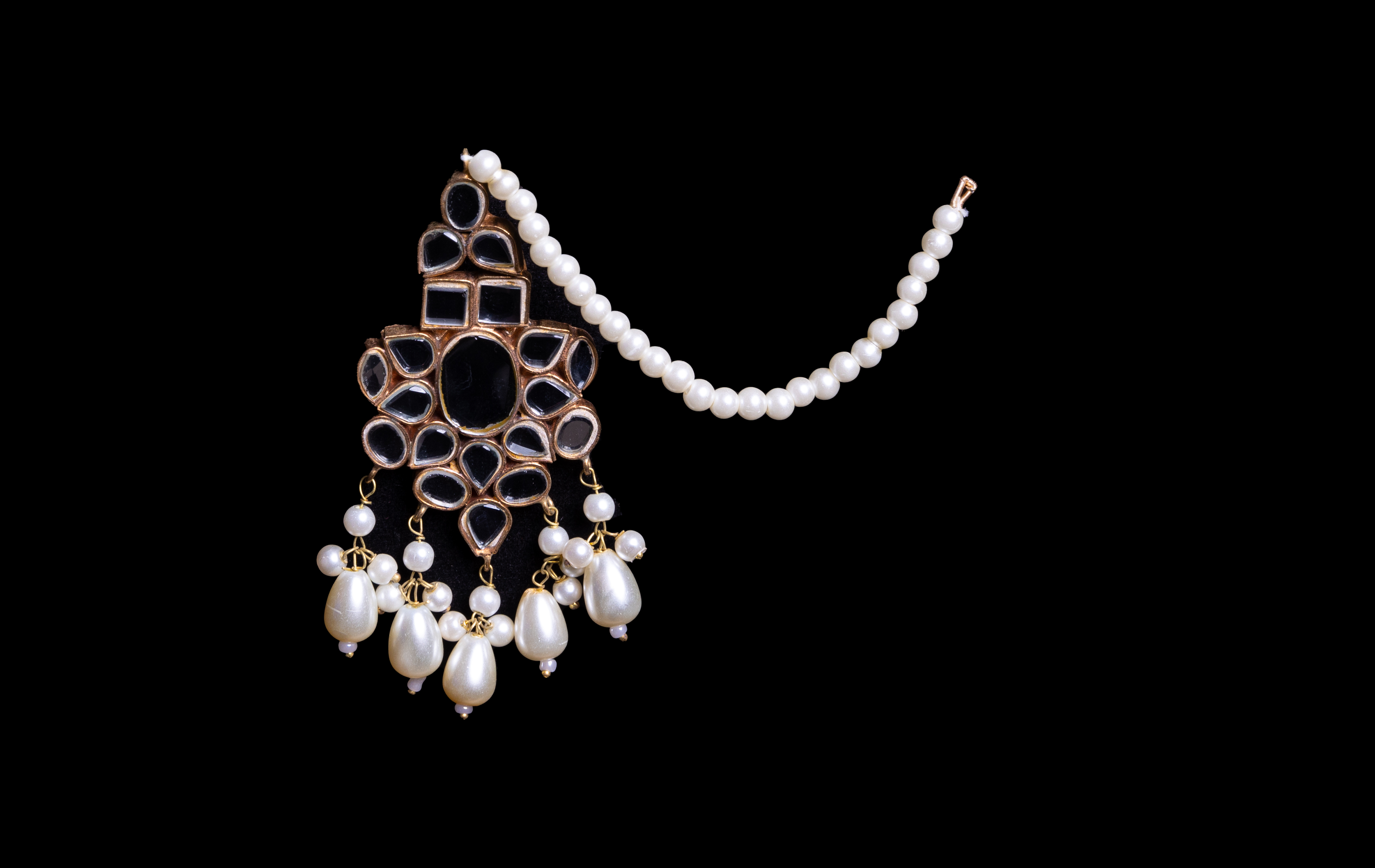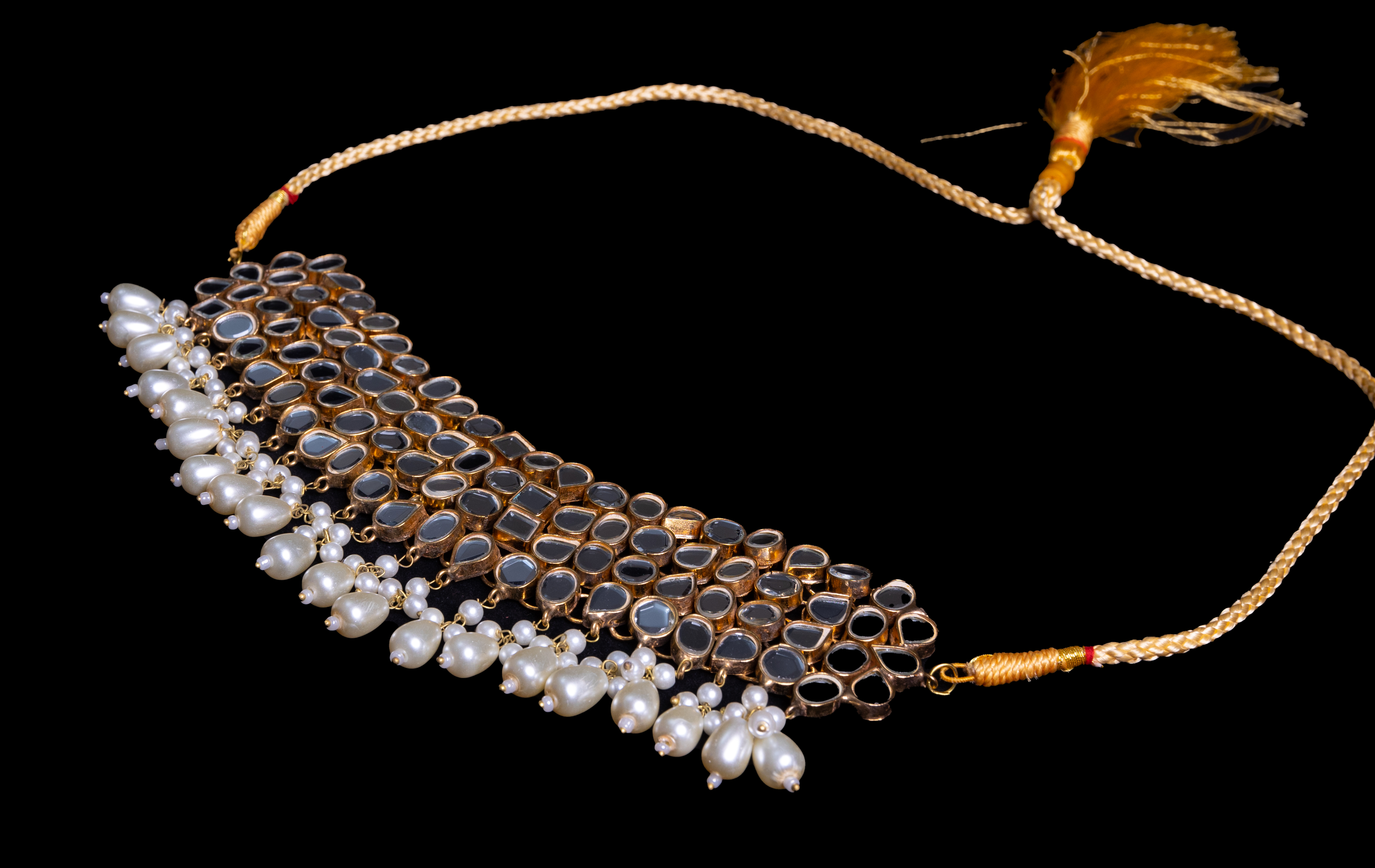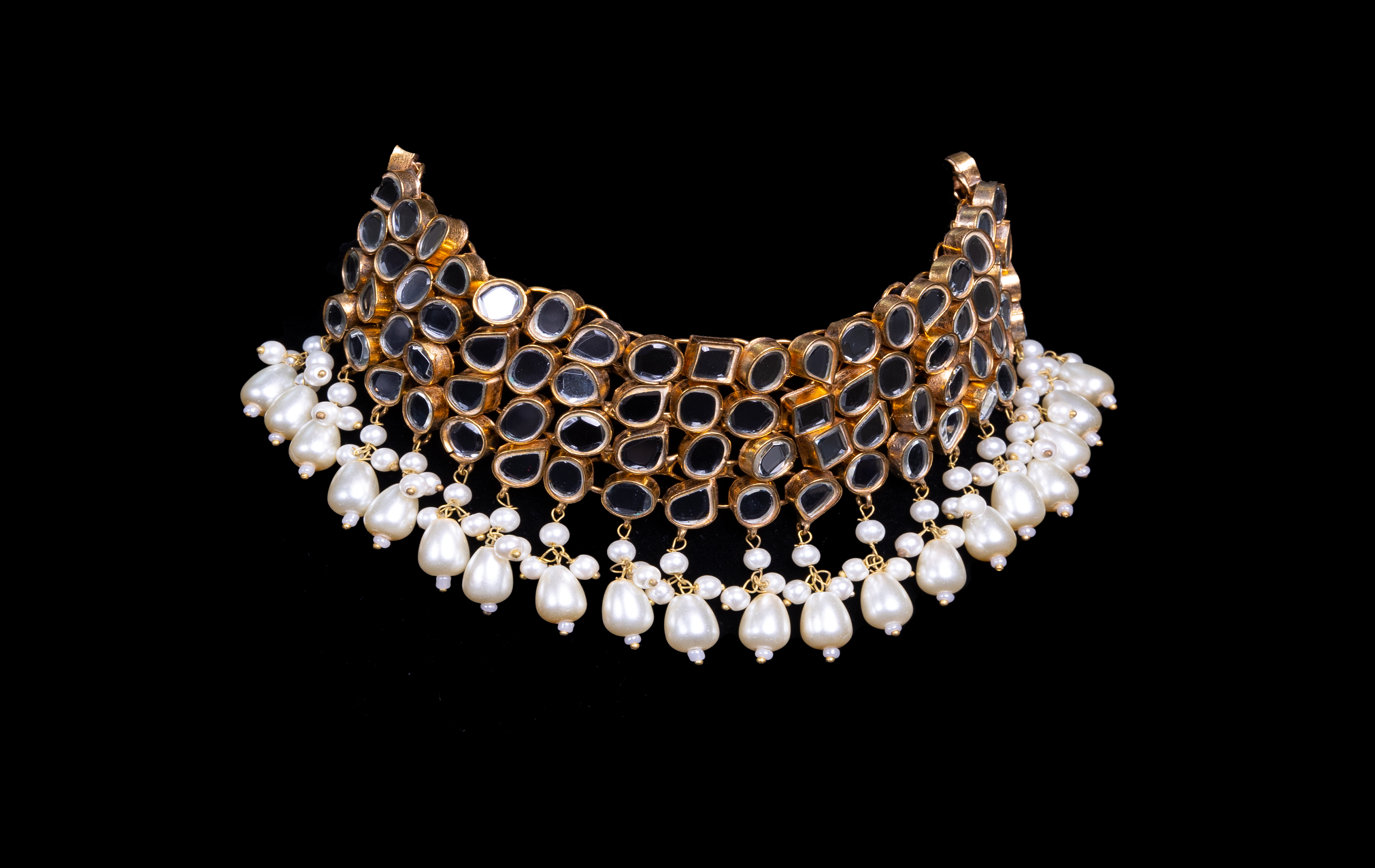 The MP1 – Mahana Party necklace is an exquisite choker-style piece featuring an intricate gold lattice framework adorned with uncut mirror-polished stones. The design is elegantly enhanced with cascading pearl drops, adding a touch of grace and opulence. This regal statement piece blends traditional artistry with a modern aesthetic, making it a perfect choice for weddings, festive celebrations, and grand occasions.