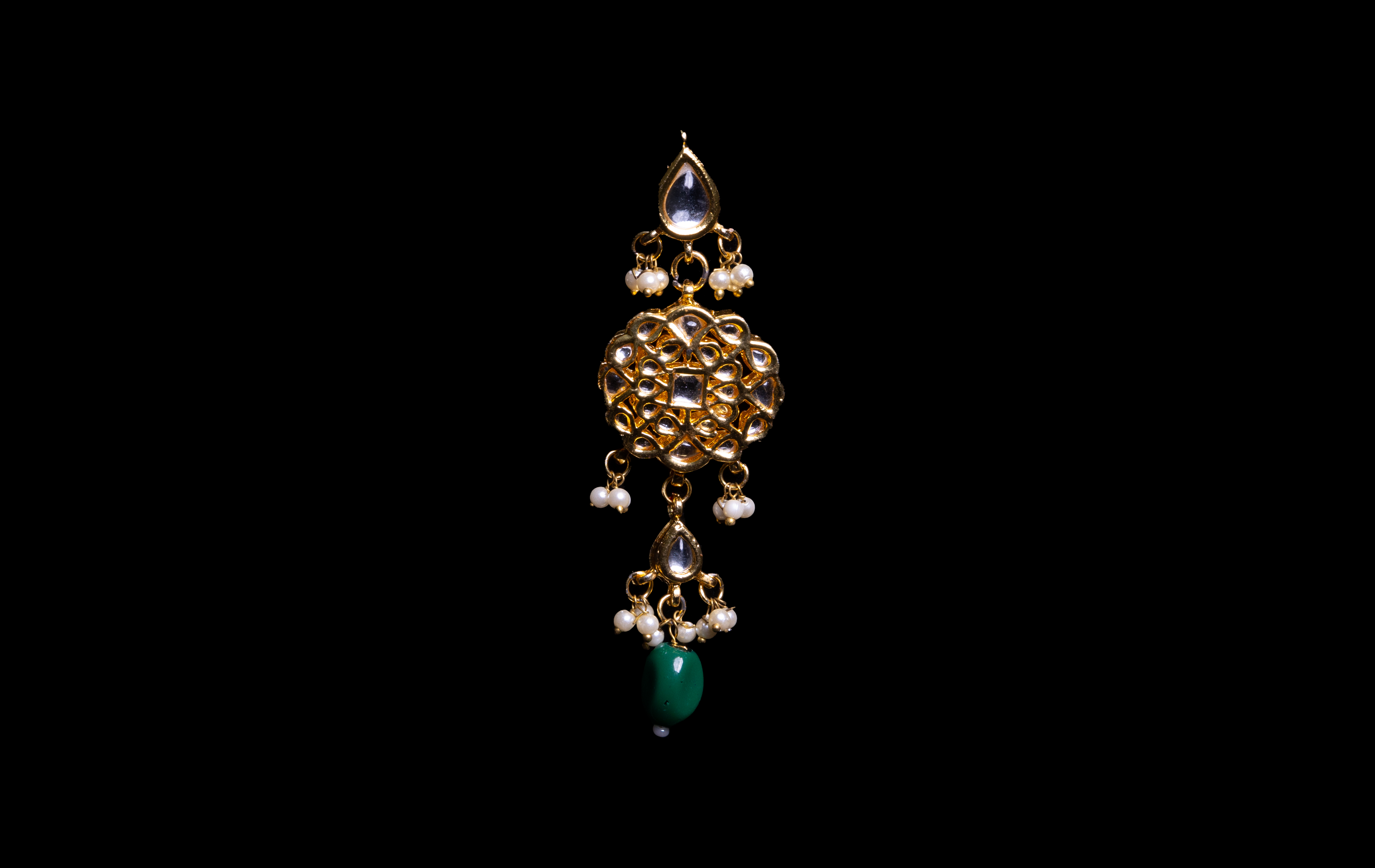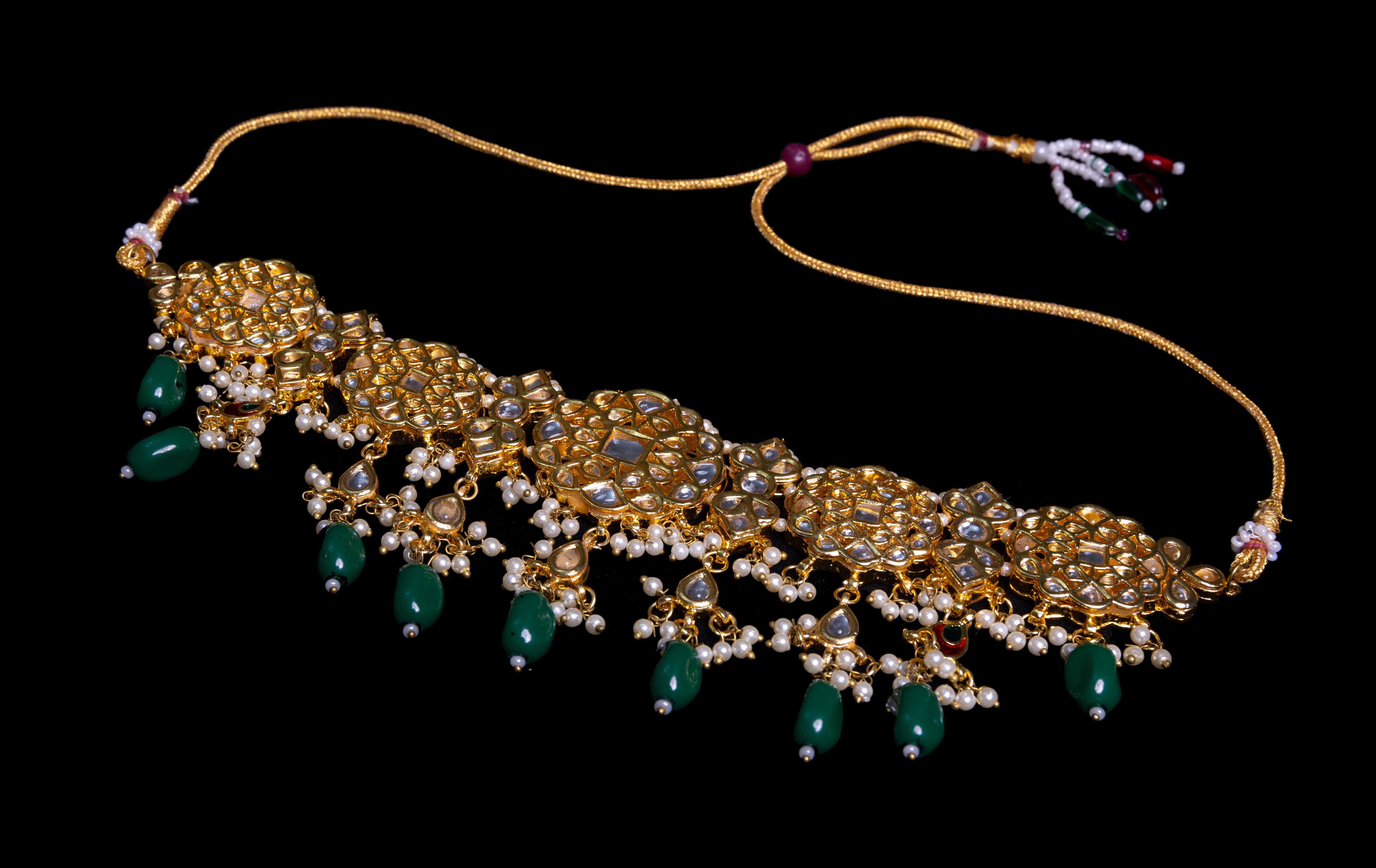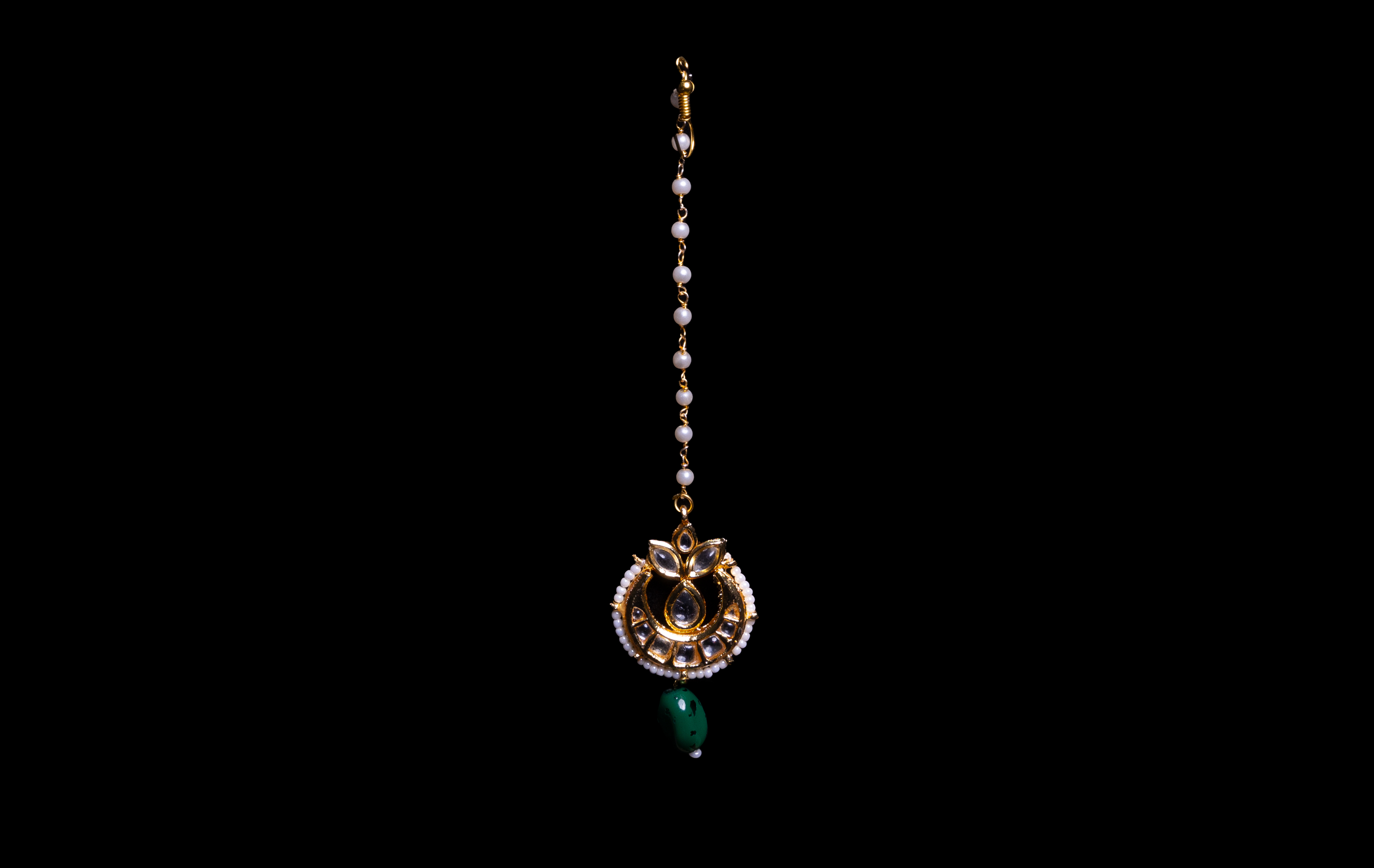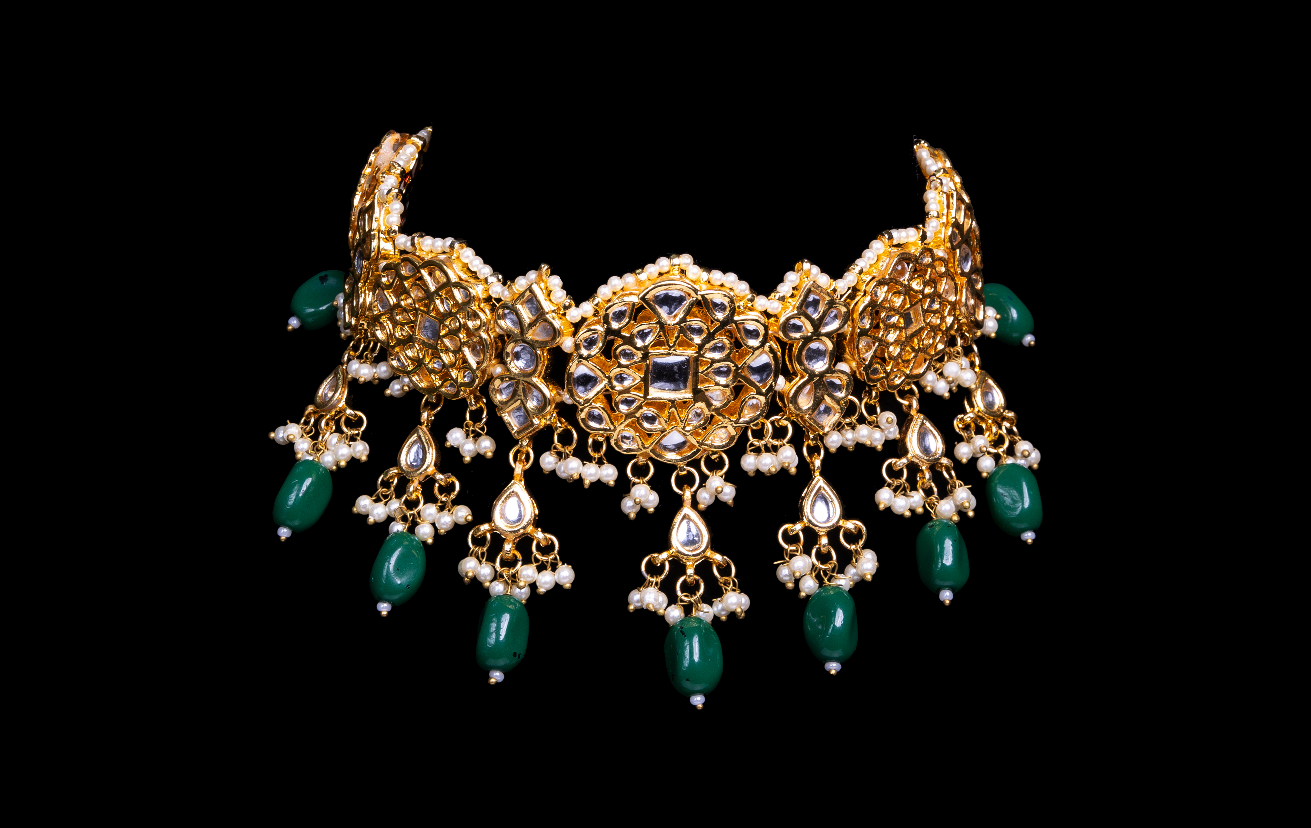This jewellery piece features an ornate gold choker with intricate detailing and embedded mirror-like stones. Delicate pearl accents complement the design, while striking deep green beads dangle gracefully, adding a bold contrast. The set includes matching earrings and a maang tikka, completing its elegant and regal appeal. All Bridal sets & ex display sets @ £50 on offer Postage £10 per set Collection available Limited stock available All offer sets are excluded from the returns policy